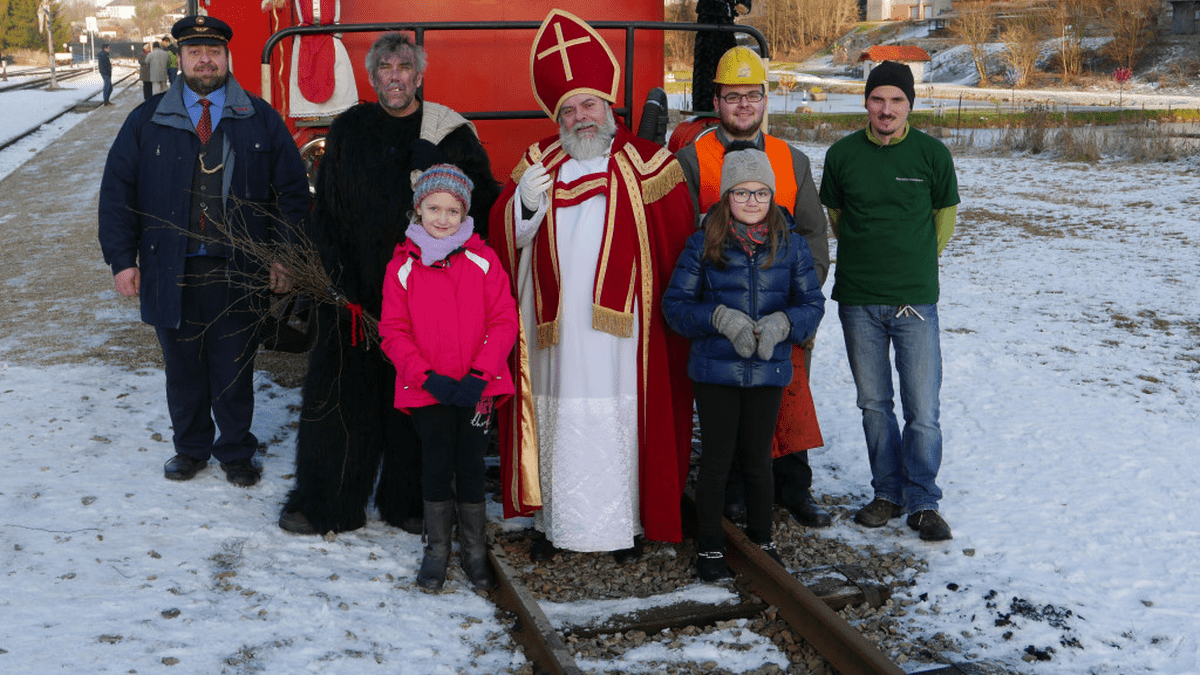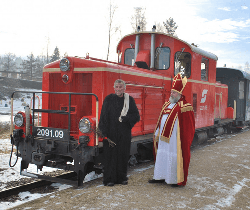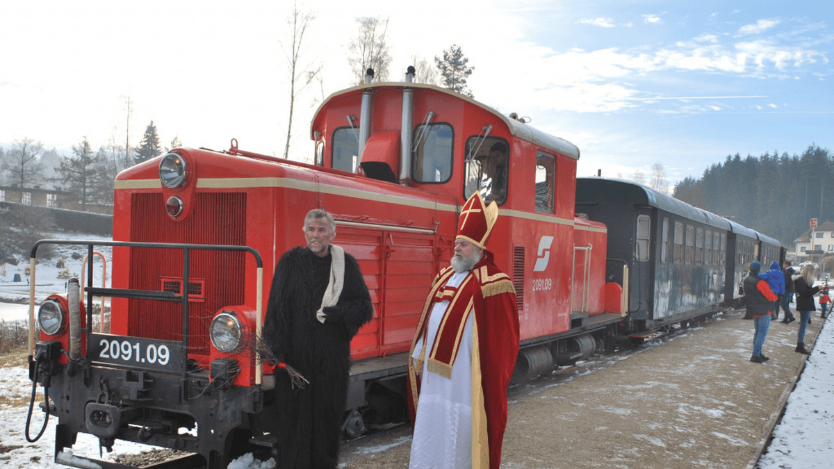 During the ride through the pre-Christmas landscape, Santa Claus and Krampus board the train and distribute gifts. Mulled wine, children's punch, and sausages provide a comforting warmth.